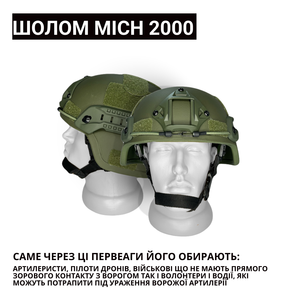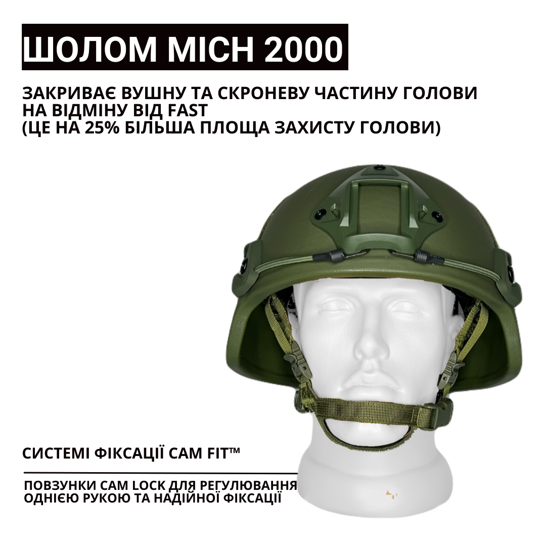 Шолом MICH 2000 NIJ IIIA (PE composite) має легку вагу, високу стійкість до зношування, збільшену область захисту – закриває вушну та скроневу частину голови на відміну від FAST (це на 25% більша площа захисту голови). Також в ньому присутня система підкладки з подушками та система кріплення підборіддя (chin-strap). Шолом виготовлений з UHMW-PE – поліетиленом високої молекулярної маси.