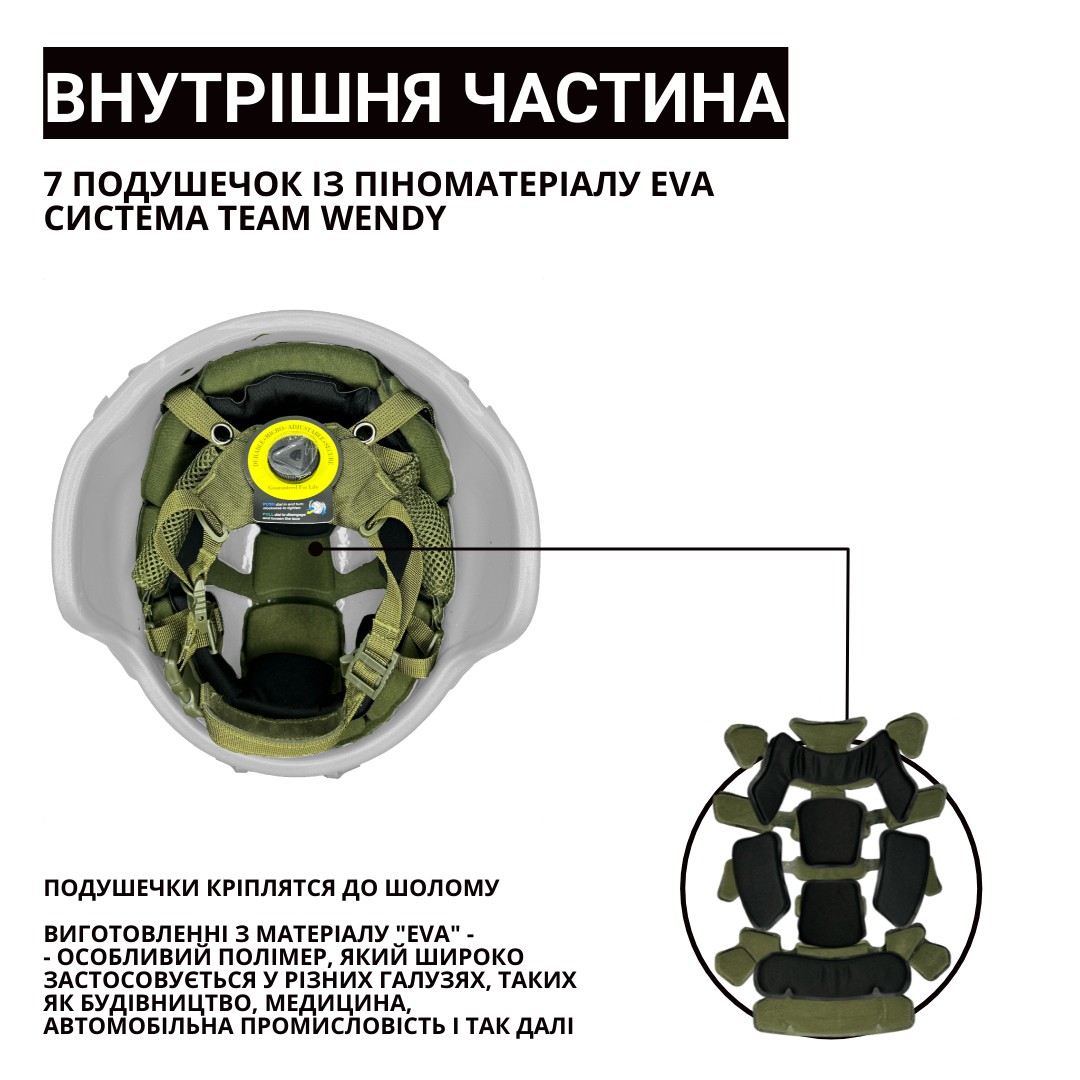 - Додатково: лобове кріплення для ПНБ, бокові рейки Пікатінні, система велкро по всій площі купола
