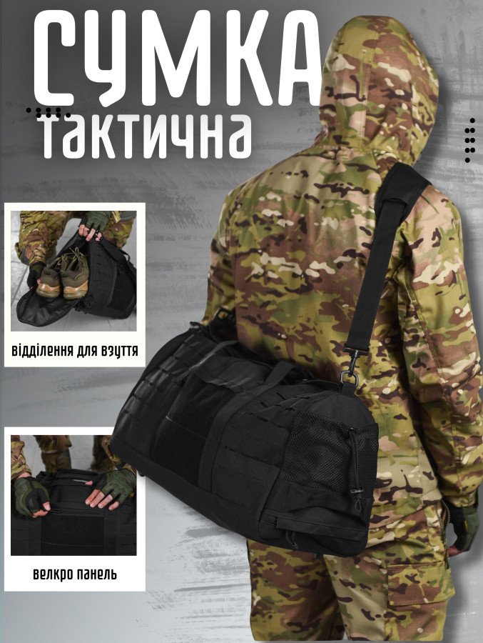 Призначення: містка та зносостійка сумка-баул для транспортування речей у відрядженнях, польових умовах або під час тривалих поїздок. Підходить як для військових, так і для цивільного використання — спорт, подорожі, робота, ротації.
