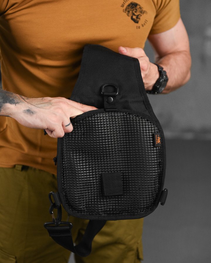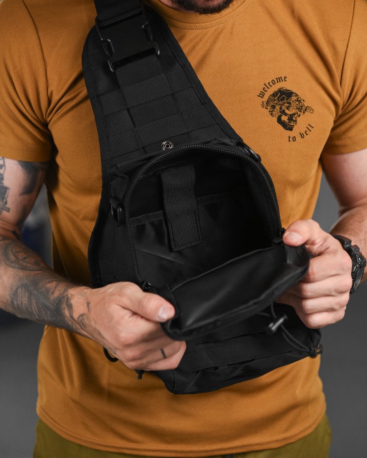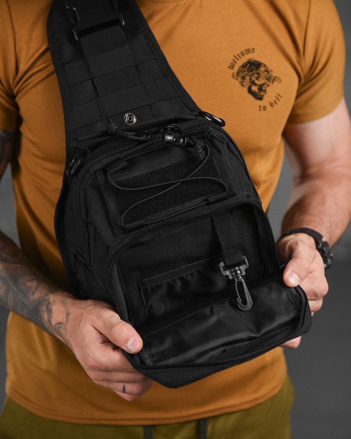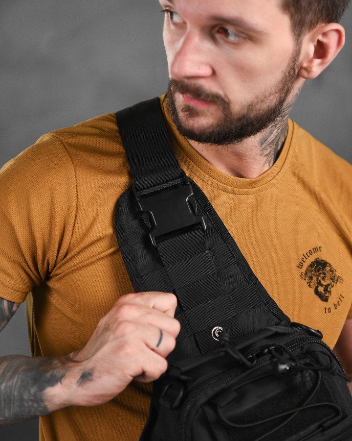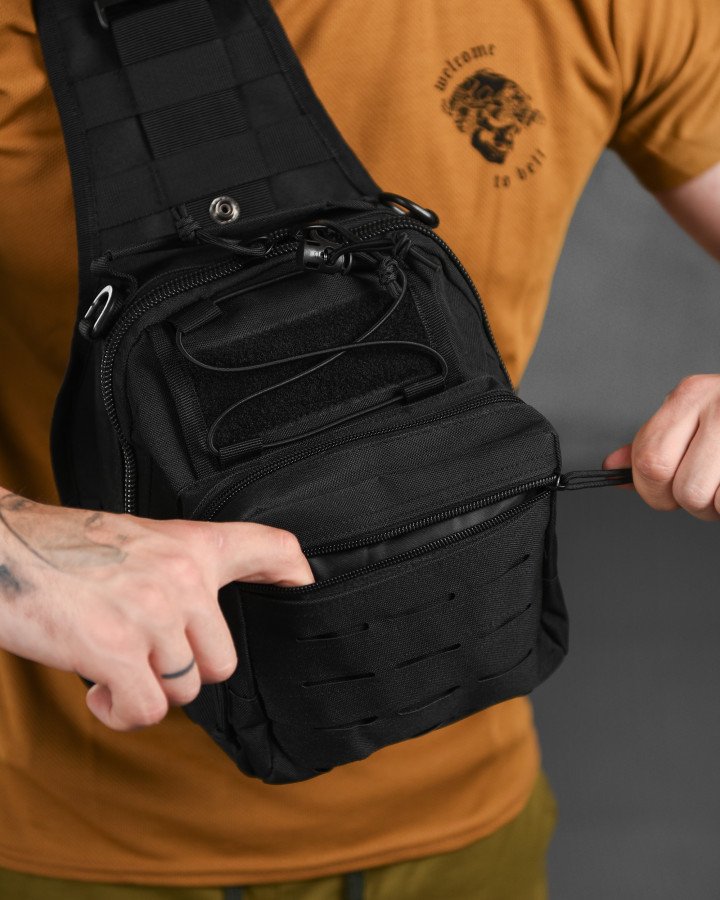 Тактична сумка для носіння на грудях або через плече. Компактна, зручна, з органайзером та кишенями. Колір — чорний.