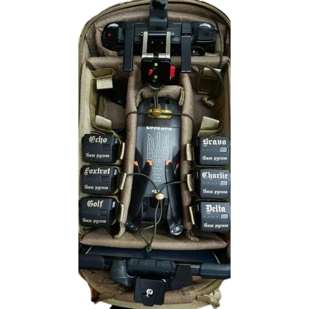 Для додаткового захисту, в передній, задній та боковій частинах рюкзака встановлено пластик товщиною 1,5 мм, що надає рюкзаку необхідну жорсткість. Також у всіх внутрішніх перегородках, крім батарейних відсіків, використовується ущільнювач товщиною 10 мм (спінений поліетилен). Батареї надійно фіксуються щільними обувними гумками, дрон та пульт управління фіксуються гумками з регуляторами. Передбачено швидке скидання рюкзака.