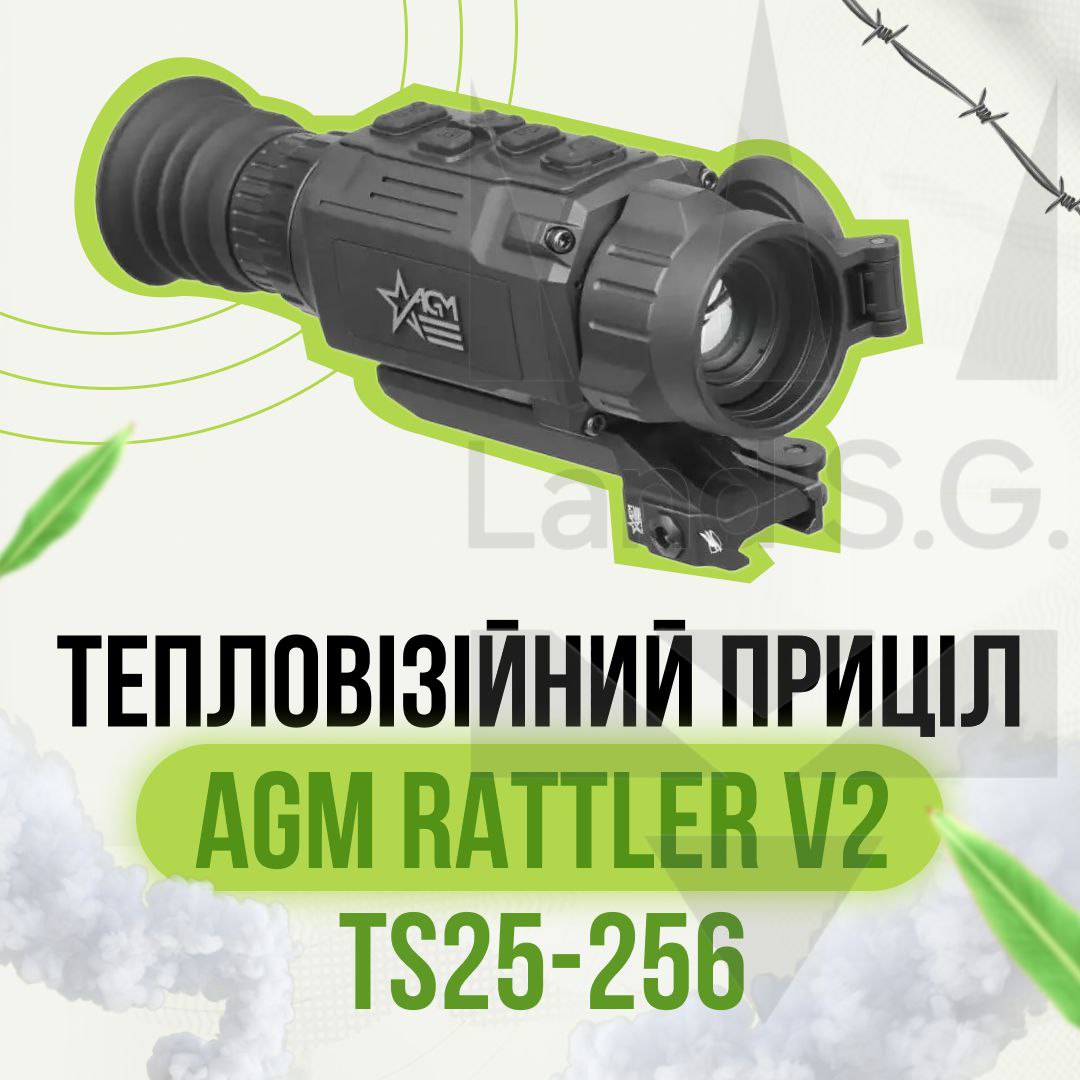 AGM Rattler V2 25-256 – бюджетний тепловізійний пристрій із оновленої серії. Модель компактна та легка, важить трохи менше 500 грам. Вона побудована на термодатчику з найменшою роздільною здатністю, яка становить 256×192 пікселів. Пристрій оснащений ширококутним об'єктивом діаметром 25 мм, що забезпечує просторе поле зору та точну стрілянину на дистанції до 1250 метрів.