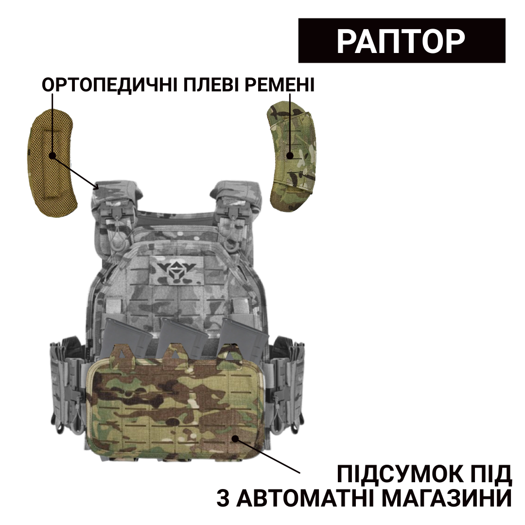 4. Матеріали: Виготовлена з високоякісних матеріалів, включаючи Cordura та нейлон 1000D, плитоноска Раптор забезпечує надзвичайну міцність та зносостійкість.