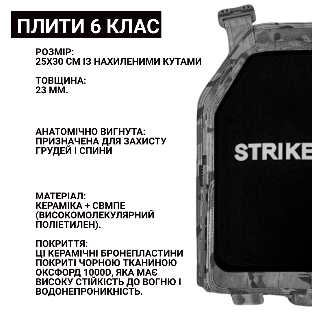 Strike Face (6 клас за ДСТУ) – це захисна керамічна бронеплита, яка є альтернативою сталевій бронеплиті. Ця плита має здатність згинатися, при цьому поглиблюючи кінетичну енергію та зменшуючи можливі пошкодження внутрішніх органів носія, а також деформується, витримуючи увесь удар. Завдяки високій жорсткості матеріалу така бронеплита надає значний опір снаряду, сповільнюючи його рух.