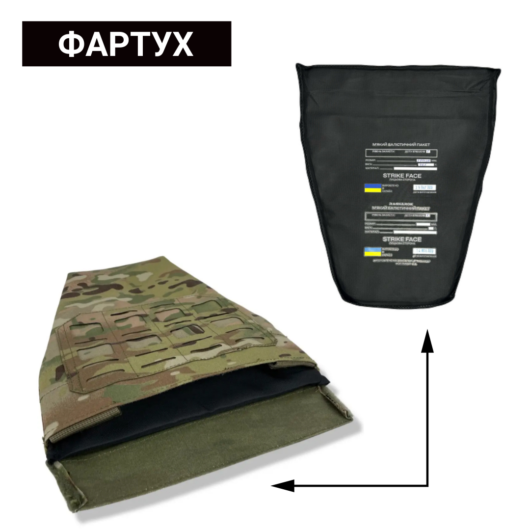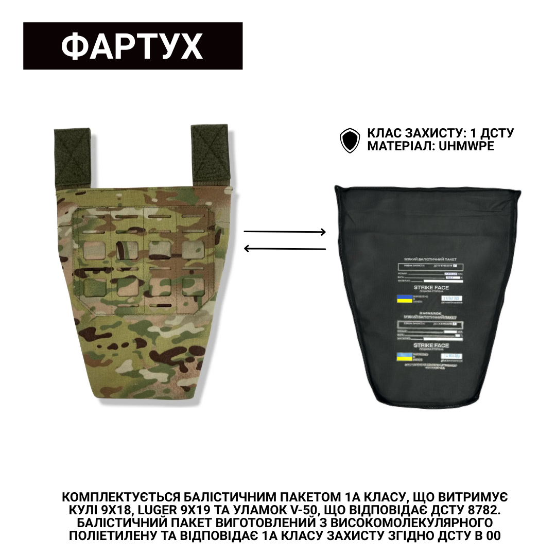 • Захищає зону паху – Цей фартух комплектується балістичним пакетом 1А класу, здатним витримати кулі 9х18, Luger 9х19 та уламок V-50, відповідаючи вимогам ДСТУ 8782