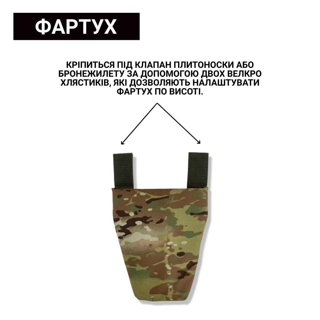• Кріплення за допомогою велкро – Фартух кріпиться під клапан плитоноски або бронежилету за допомогою двох велкро хлястиків, які дозволяють налаштувати його по висоті.