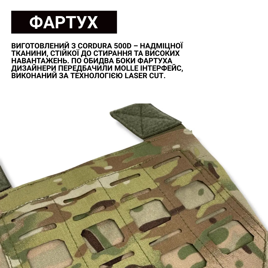 • Дизайнери передбачили MOLLE інтерфейс по обидва боки фартуха, виконаний за допомогою технології Laser Cut, що дозволяє зручно розміщувати додаткове спорядження.