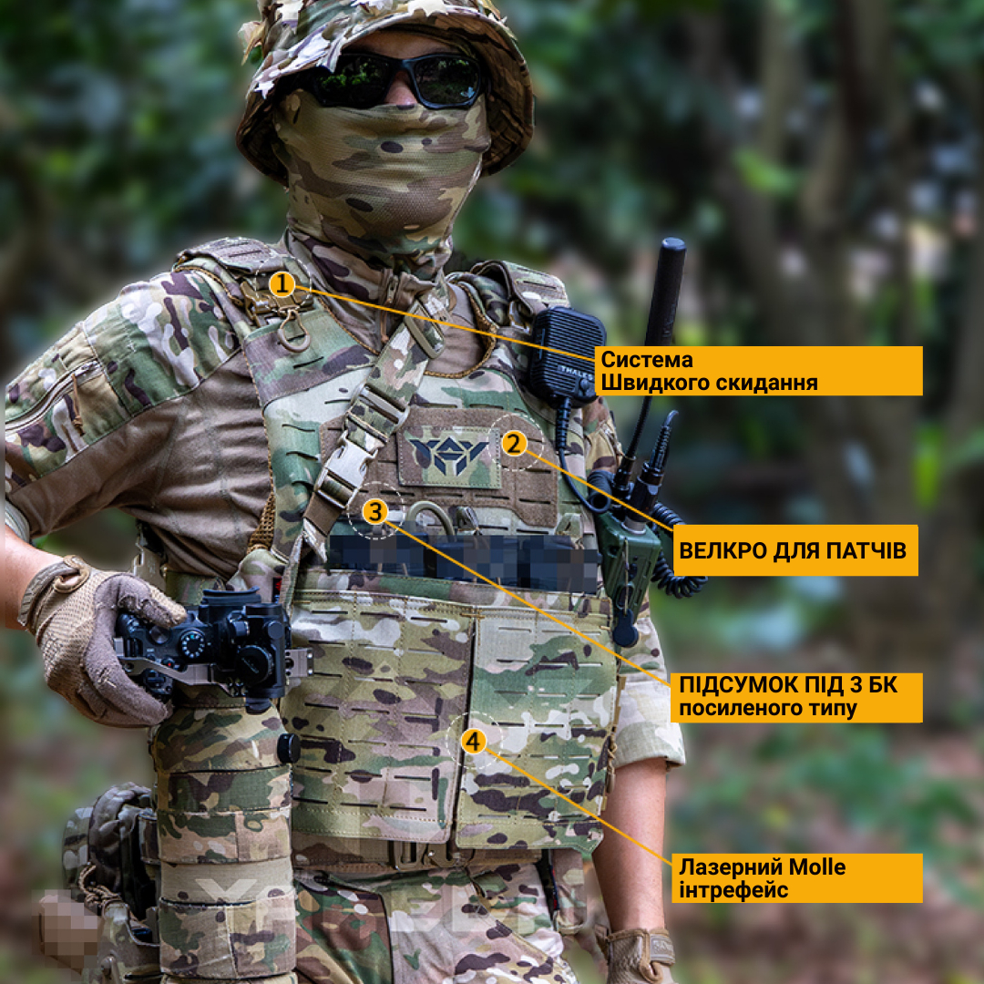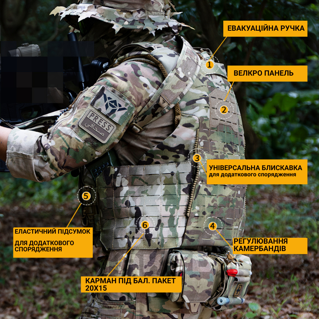Плитоноска РАПТОР Type 2 забезпечує надійний захист і комфорт завдяки 4 зонами швидкого скиду, кишені під м’який захист та посиленому пластиковому підсумку для БК.