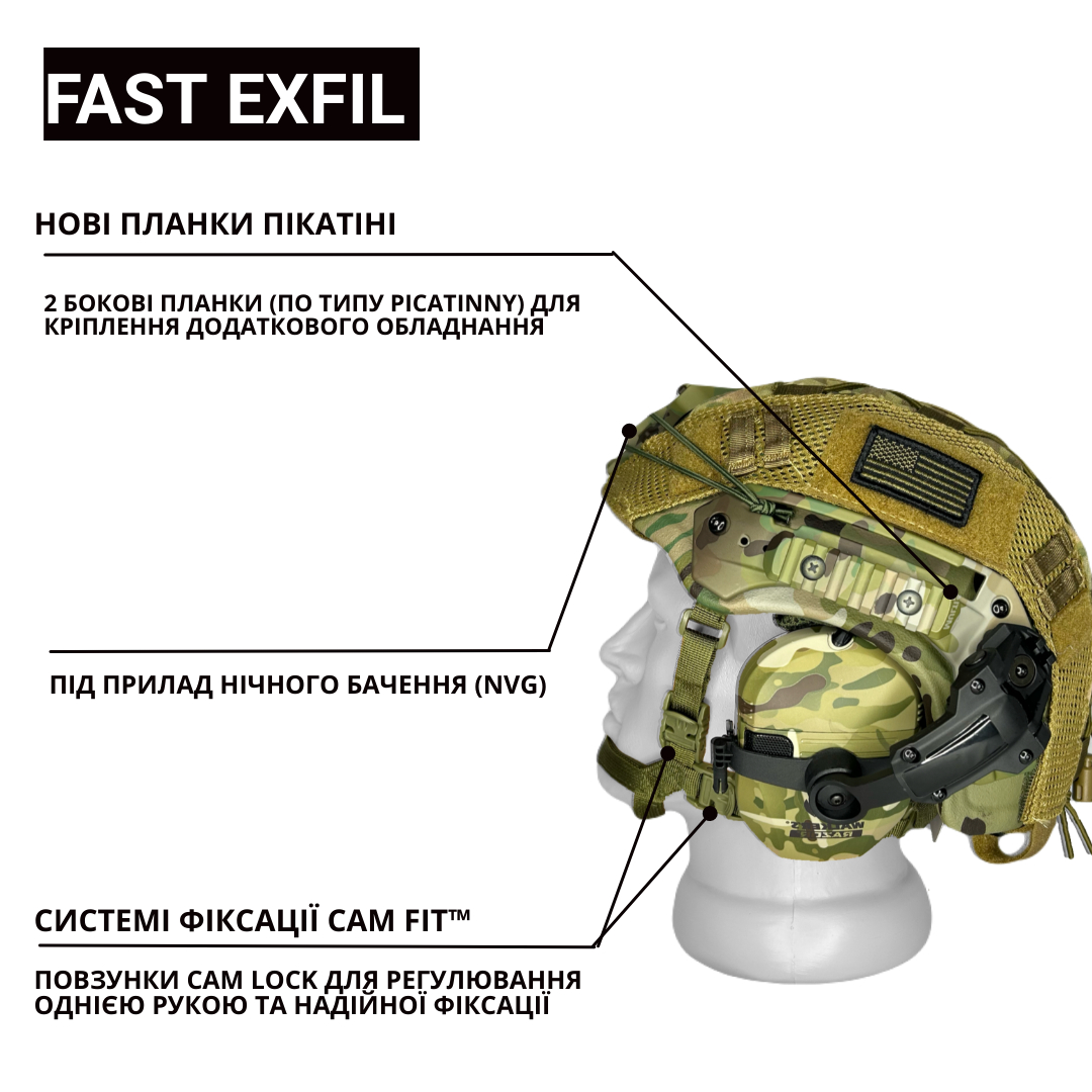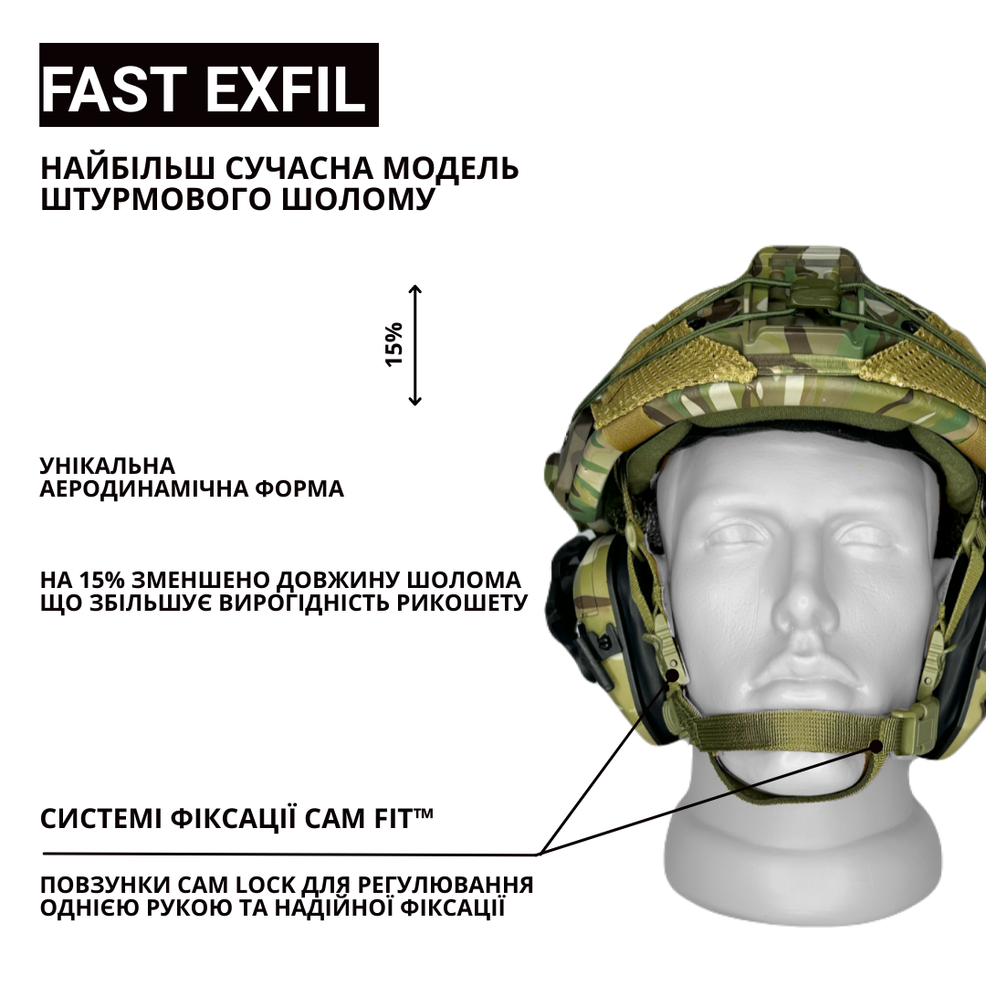 Нова версія Сучасного шолома FAST > FAST EXFIL MultiCam  Також на системі Team Wendy рівень захисту NIJ IIIA – 1 клас по ДСТУ. Був зроблений на базі легендарних американських шоломів Team Wendy з удосконаленою геометрією, яка дозволяє використовувати шолом одягнений на навушники, як на звичайні так і на активні.